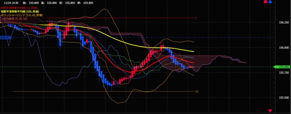 商いの薄い中でのドル円相場。下がったところは買いとタカをくくっていたところ、155.5円付近まで急落した。(S1付近)156円キリバン付近、156.10付近でロングを仕込んだが、見事にS1まで持ってかれた。やはり来年は上がりそうだからロングというのは辞め、意識される価格帯まで引き付けたいとは思う。大衆心理は大口に見透かされている。156円キリバン付近は損切出来たが、156.10付近は恐らく利益確定売りもあり、再び売りに転じている。